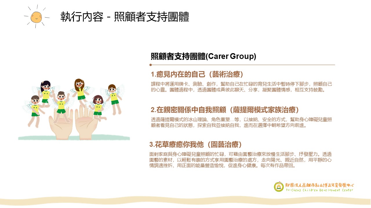 入選單位:財團法人高雄市私立博正兒童發展中心「FUN心療聊,攜手同行 」110年度身心障礙兒童家庭照顧者支持服務計畫